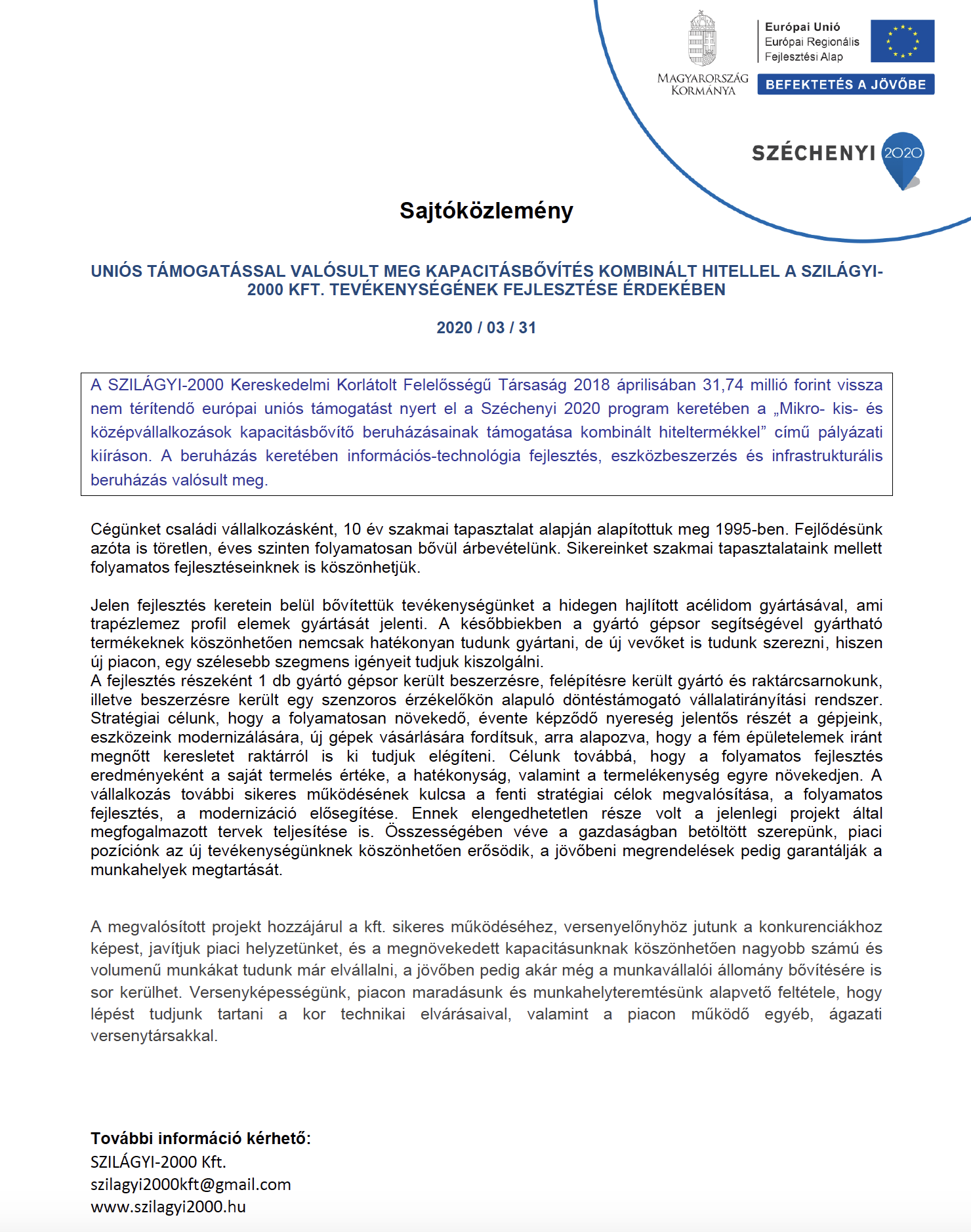 UNIÓS TÁMOGATÁSSAL VALÓSULT MEG KAPACITÁSBŐVÍTÉS KOMBINÁLT HITELLEL A SZILÁGYI-2000 KFT. TEVÉKENYSÉGÉNEK FEJLESZTÉSE ÉRDEKÉBEN